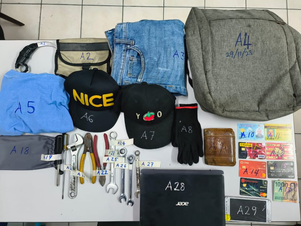 “Turut ditemukan pelbagai peralatan di dalam beg sandang suspek dipercayai digunakan bagi tujuan kegiatan jenayah dan pecah rumah.