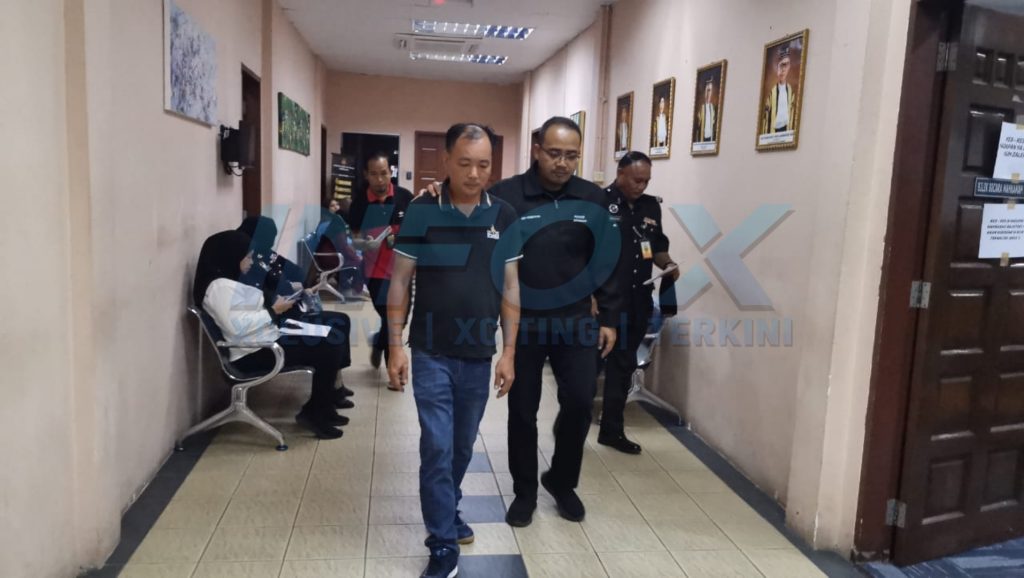 Tertuduh (kiri) diiring keluar selepas prosiding mahkamah dijalankan di Mahkamah Sesyen Khas Rasuah, Tawau.