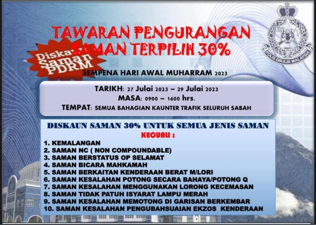 Pengumuman itu dibuat di laman Facebook Jabatan Siasatan dan Penguatkuasaan Trafik (JSPT) Sabah, hari ini yang memaklumkan tawaran itu sempena sambutan Maal Hijrah 2023 / 1445 H.