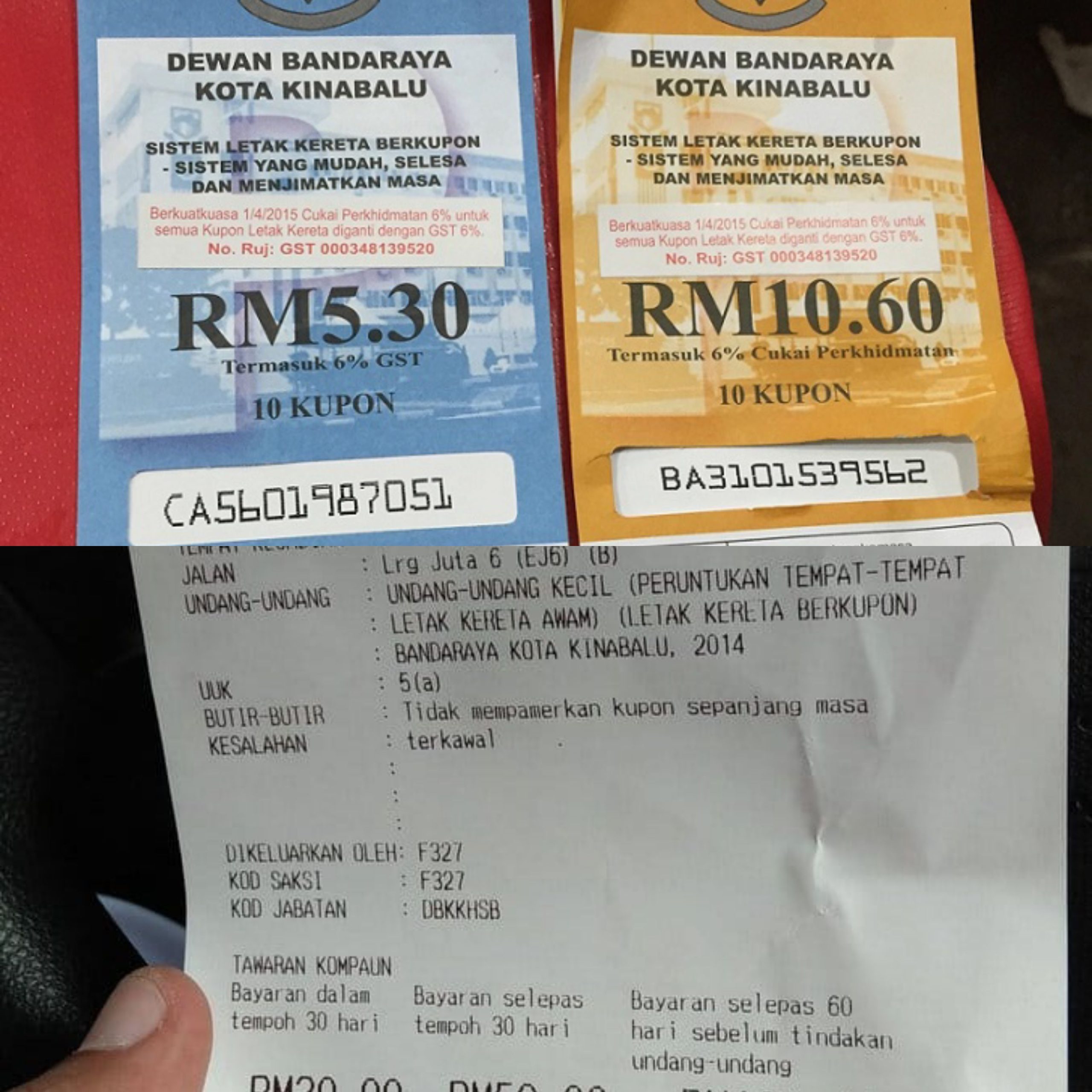 Katanya, ia bagi kesalahan Undang- Undang Kecil (Peruntukan-peruntukan Tempat Letak Kereta Awam) (Letak Kereta Awam Berkupon) Bandaraya Kota Kinabalu 2014 dan Undang-undang Kecil (Jalan-Jalan dan Tempat Awam) Bandaraya Kota Kinabalu 1966, Pindaan 2008.