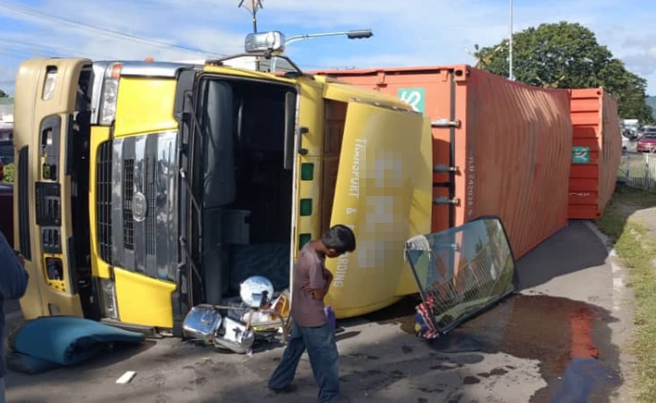 TAWAU: Sebuah treler membawa muatan minyak masak terbalik dalam kemalangan berhampiran lampu isyarat Batu 3, Jalan Apas, di sini, semalam.