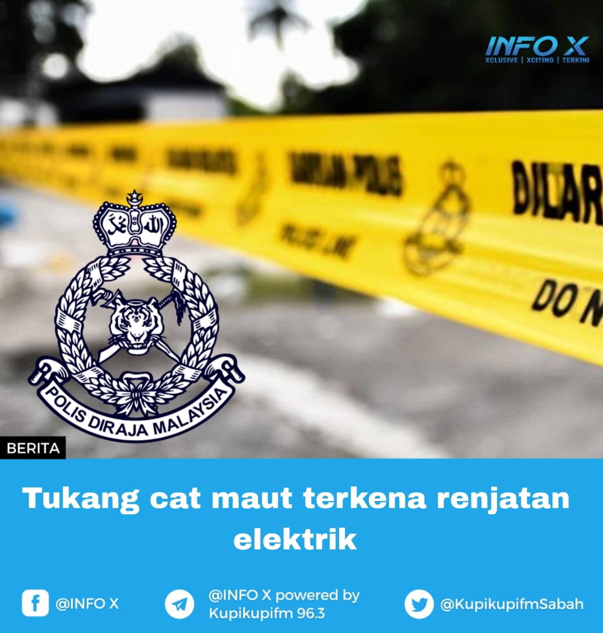 KOTA KINABALU: Seorang tukang cat kereta maut akibat terkena renjatan elektrik di luar bengkel di Kampung Sinulihan, Inanam, di sini, awal pagi semalam.