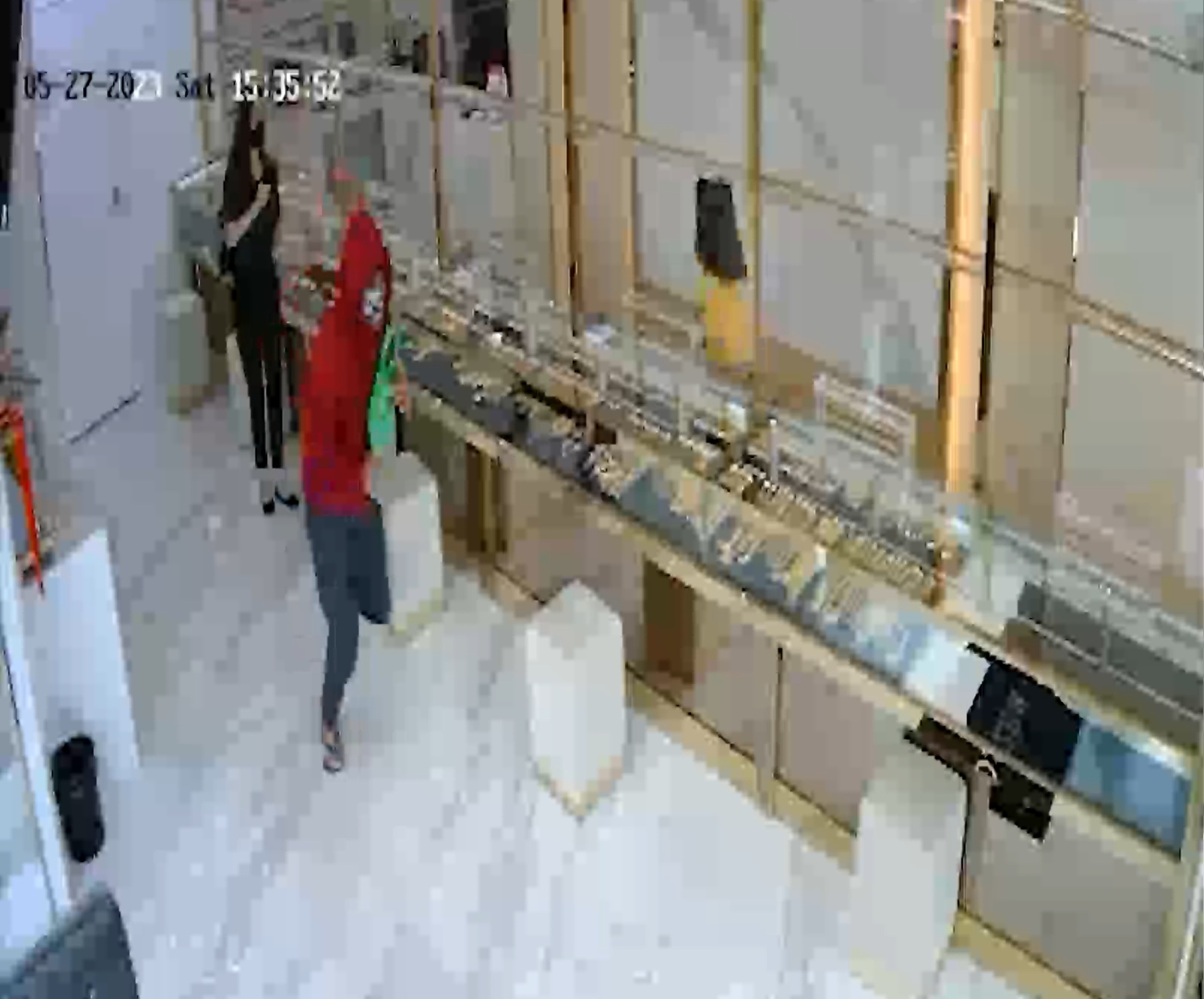 Dalam rakaman CCTV itu menunjukkan lelaki memakai baju hoodie warna merah secara perlahan mendekati mangsa yang sedang berurus niaga beli emas.