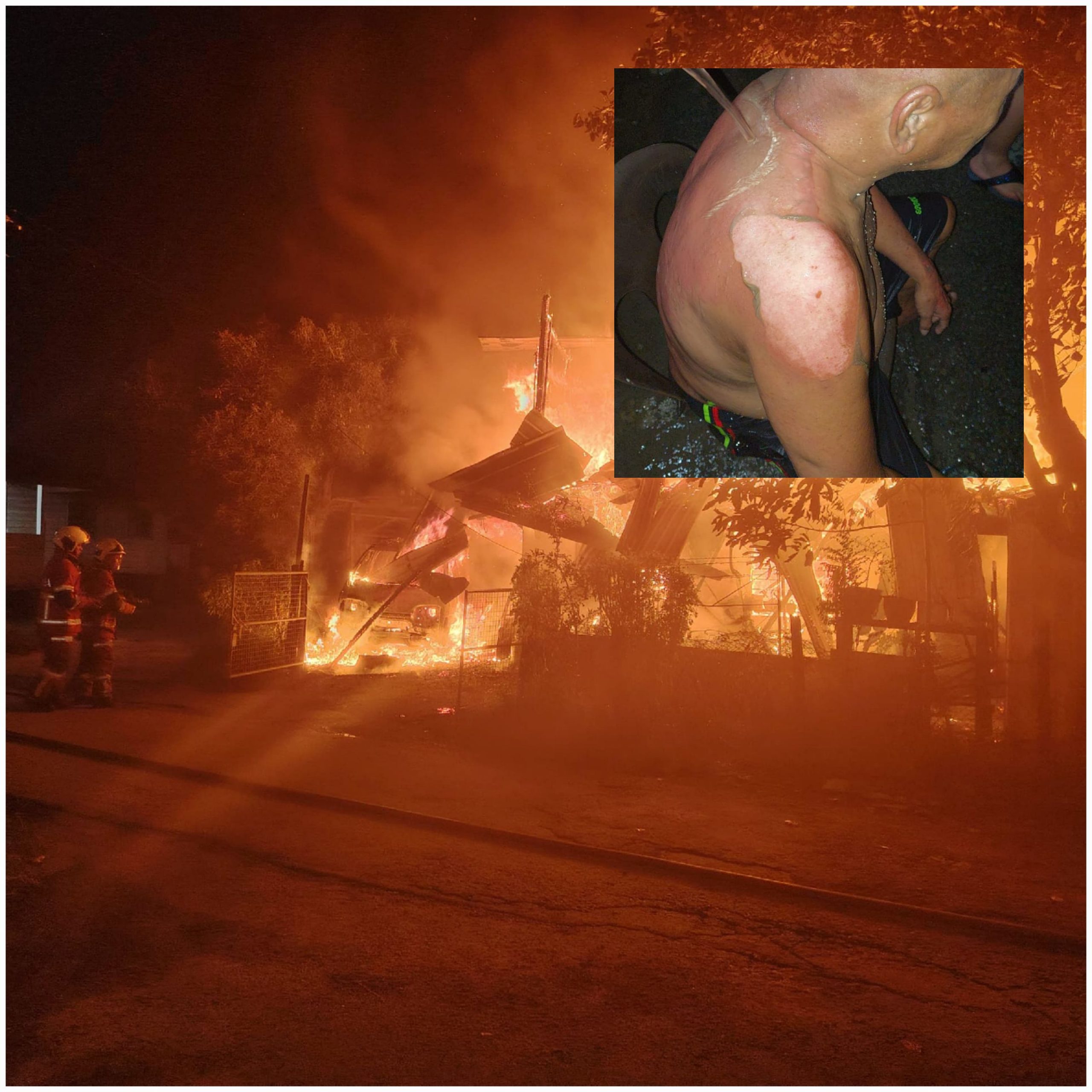 PENAMPANG: Seorang lelaki warga emas melecur belakang badan ketika cuba menyelamatkan barang milik selepas rumahnya terbakar di Jalan Hiko, Kampung Hungab, di sini, malam tadi.