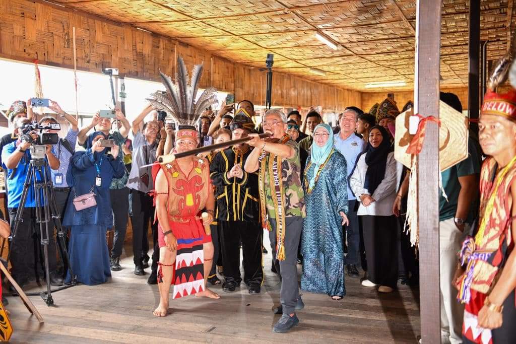 Sementara itu, baginda berdua serta paduka anakanda kemudiannya mencuba aktiviti menyumpit dan menyaksikan demo permainan lansaran di rumah tradisi Murut.